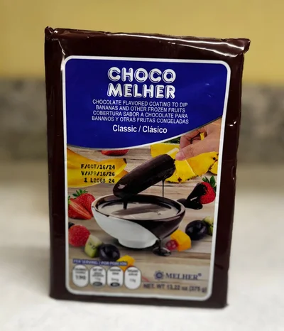 Cobertura de chocolate para elaborar chocobananos, contiene cacao en polvo, chocolate y azúcar.