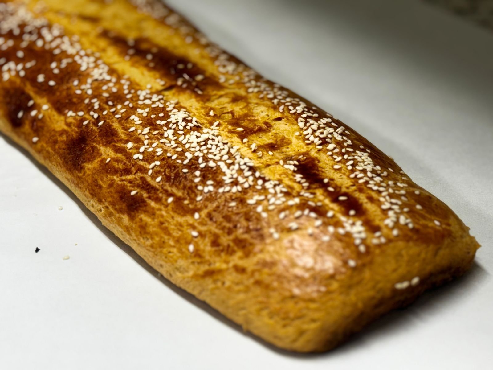 Pan rectangular, dorado, hecho de masa firme, sabor mantequilloso y adornado con ajonjolí.